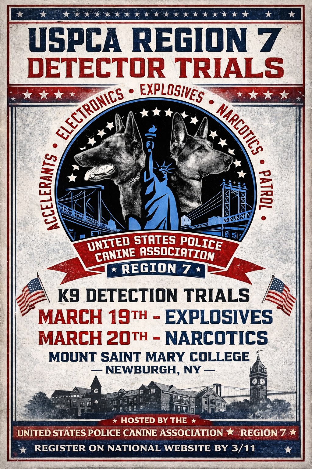 USPCA Region 7 Explosives and Narcotics Certification Trials Dates: March 19th - Explosive Detection/ORT at 0800 hours March 20th - Narcotic Detection at 0800 hours Location: Mount Saint Mary's College, Newburgh, NY REGISTER HERE by March 11th, please. Certification is free for Region 7 Primary and dual paid members. All others welcome, but please select the payment option of $50. Contact: Lt Alison Gentile [email protected] |